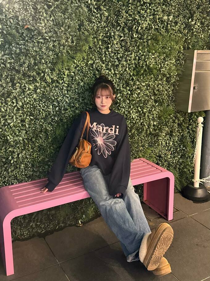投稿では、緑の植物に覆われた壁を背景に、ピンクのベンチにリラックスした様子で座る姿を披露。黒いオーバーサイズのスウェットシャツに青系のデニム、ベージュの靴を合わせたリラックス感のあるスタイリングが印象的です。