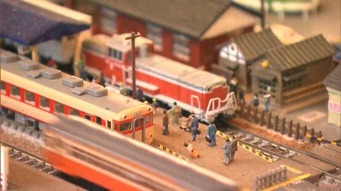 実際の約150分の1のサイズに縮小した、鉄道模型「Nゲージ」です。精巧に作られた昔の街の中にたたずむのは、「急行色の気動車」と「ディーゼル機関車」です【画像】。