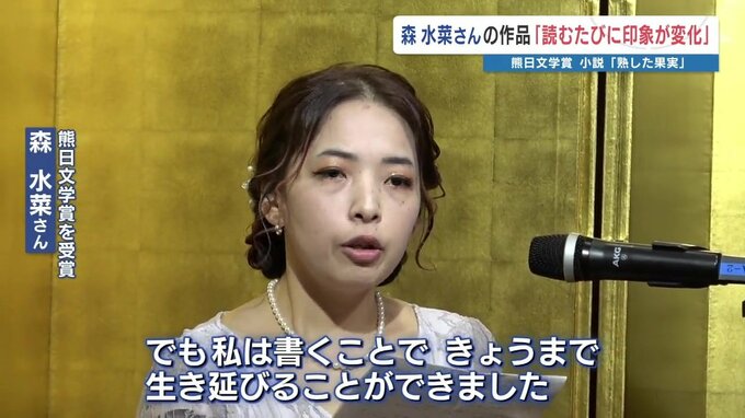 熊本県内に住む作家の優れた文学作品を表彰する、「熊日文学賞」の贈呈式が開かれました。今回、熊日文学賞を受賞したのは、阿蘇市の会社員、森水菜さんの公募小説「熟した果実」です。この小説は、火葬場で働く女…