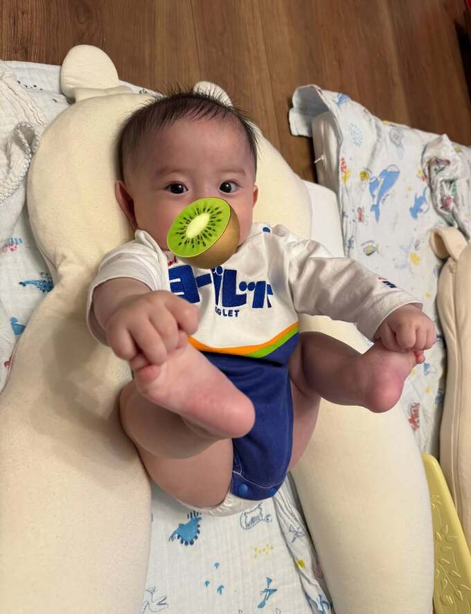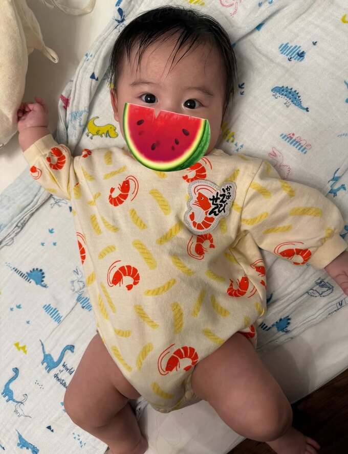 翔子さんは「またまたかわいいロンパース♡」「ヨーグレットとかっぱえびせんです」と、国民的お菓子のパッケージやロゴにちなんだロンパースを双子に着せてご満悦。かっぱえびせんを着たお兄ちゃんが布団の上で70年代のジョン・トラボルタのようなポーズを取っています。
