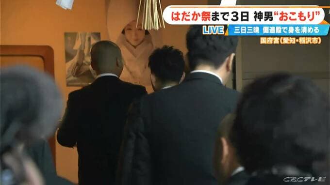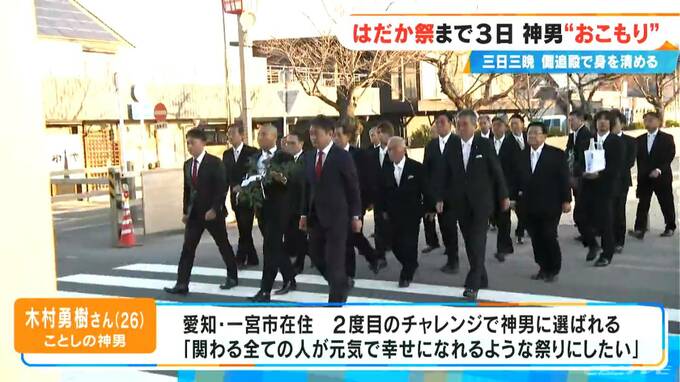 午後5時前、今から「おこもり」が始まるということで、ことしの神男・木村勇樹さんが建物の中へ入って行きました。