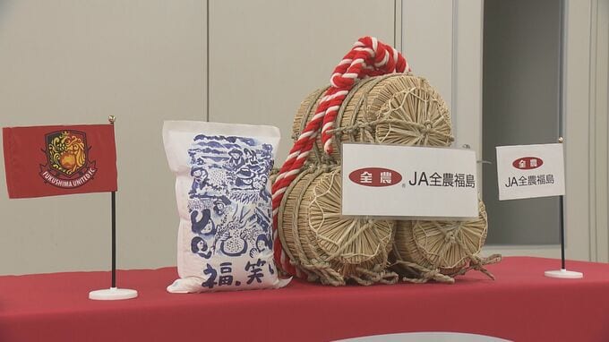 サッカーJ3の福島ユナイテッドFCを応援しようと、JA全農福島から県産のコメ1トンが贈られました。福島市で行われた贈呈式には、福島ユナイテッドFCの鈴木勇人社長が出席し、JA全農福島から県のブランド米「福、笑…