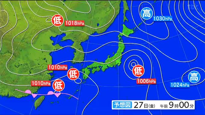 27日午前9時の予想天気図です。東北地方は、北海道の東の高気圧から吹く湿った東風の影響で、太平洋側を中心に雲が多くなるでしょう。