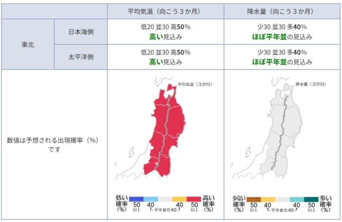 東北日本海側:高い見込み 東北太平洋側:高い見込み
