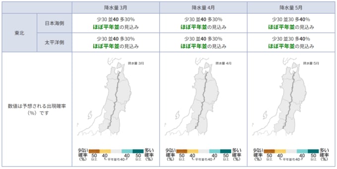 東北日本海側:平年並か高い見込み 東北太平洋側:平年並か高い見込み