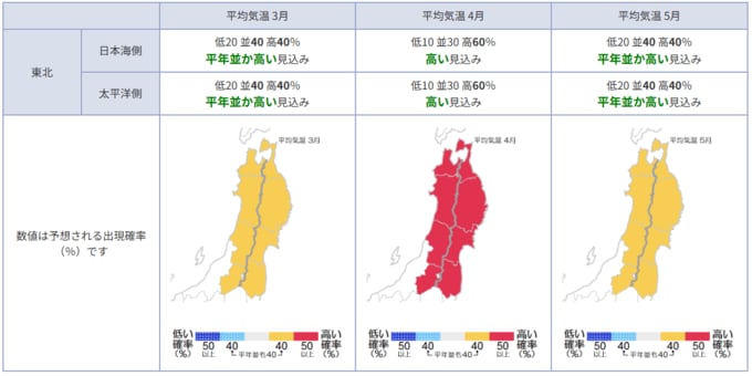 東北日本海側:平年並みか高い見込み 東北太平洋側:平年並か高い見込み