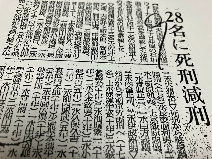 1949年2月11日の毎日新聞。終戦の年に石垣島で米軍機搭乗員3人を殺害したとして横浜軍事法廷で死刑を宣告された41人に対する再審の結果が掲載された。41人のうち28人が減刑されたものの、13人はやはり死刑のままだった。1人目の米兵を斬首した海軍の特攻、震洋隊の隊長・幕田稔大尉もやはり「死刑確定者」とされた13人のうちの一人だった。発表の前日、スガモプリズンでは死刑が執行される8人が死刑囚の棟から連れ出された。死刑囚たちは毎日、生と死の間で揺さぶられていたー。
