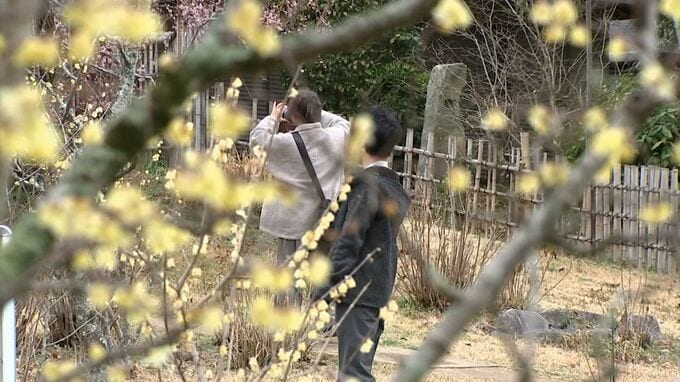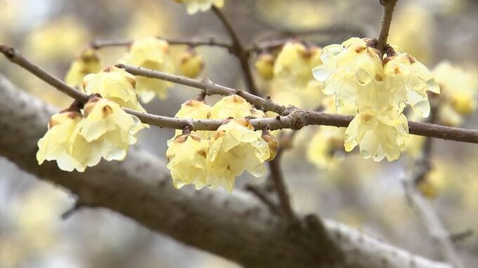 ロウの様につややかな花びらが特徴の「ロウバイ」です。1月下旬から花をつけ始め今、見頃を迎えています。辺りいっぱいに漂う甘い香りに包まれながら訪れた人は足を止めてひと足早い春の訪れを楽しんでいました。