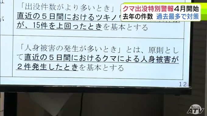 青森県内のツキノワグマの出没件数は去年3143件で、1992年の統計開始以降で過去最多となりました。県は今年の対策を協議するなか、より実態に即した広報をするために警報や注意報の発表基準を4月1日から見直すことを決めました。