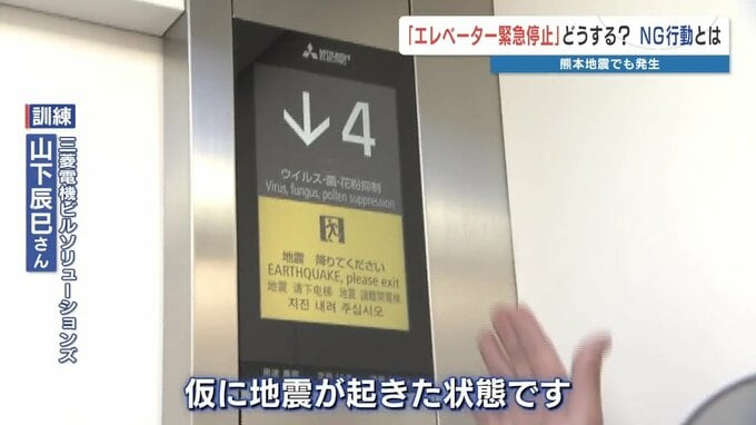 三菱電機ビルソリューションズ 山下辰巳さん「地震が起きると、表示とアナウンスが出て最寄り階に停止します。扉が開いたら出ていただく。この時に、外から乗り込まないように照明も消えます」
