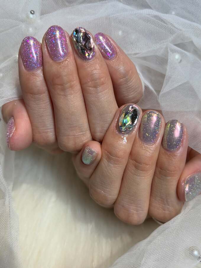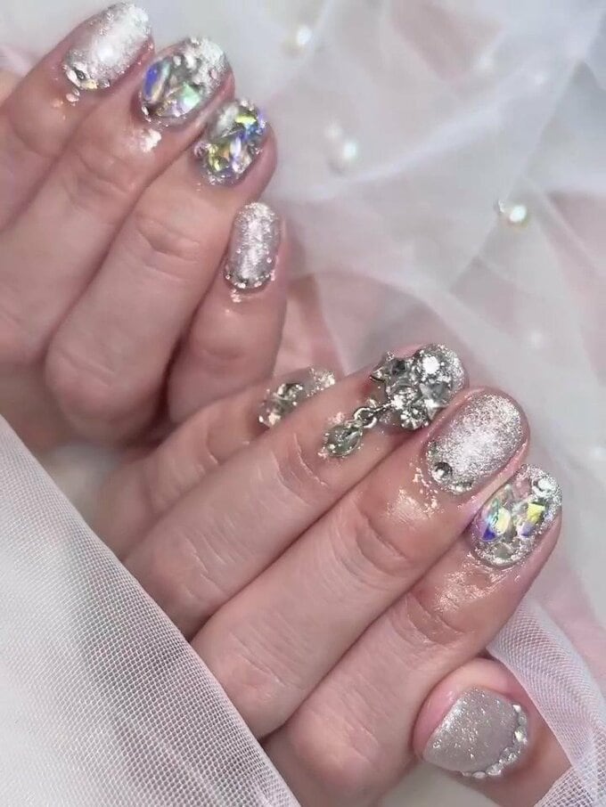 別のデザインでは、銀色のラメをベースに、宝石のような大粒の装飾が散りばめられ、光の反射により美しく輝く様子が表現されています。