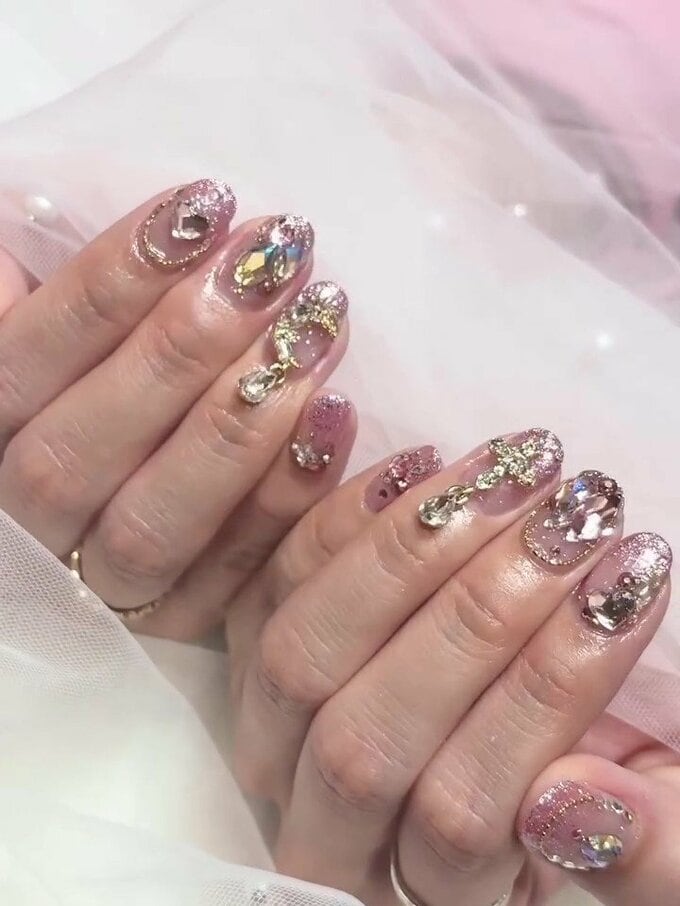 岡田さんは今回、複数のデザインパターンのネイルを公開。まずは、淡いピンクをベースにしたデザインのネイル。金色・銀色のパーツとクリスタルが散りばめられ、中には十字架を模した装飾もみられます。
