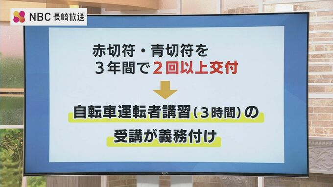自転車の『青切符』4月スタート ながらスマホで1万2千円反則金 16歳以上は高校生も対象「今日初めて聞いた…」 長崎放送 2026年2月26日(木) 19:29 国内 3年間で2回以上→「講習」が義務 さらに、青切符や赤切符を3年間で2回以上交付された場合、専用の「自転車運転者講習」を受けることが義務付けられます。