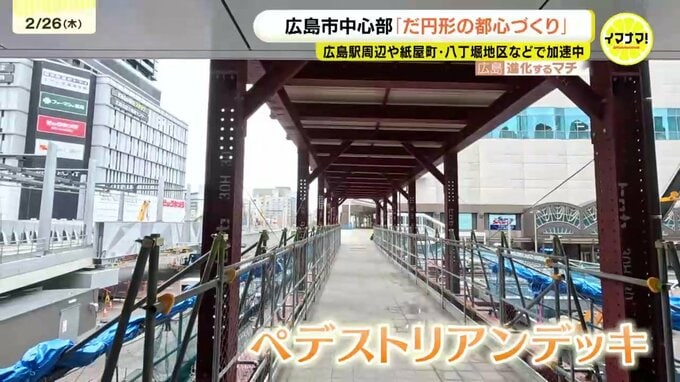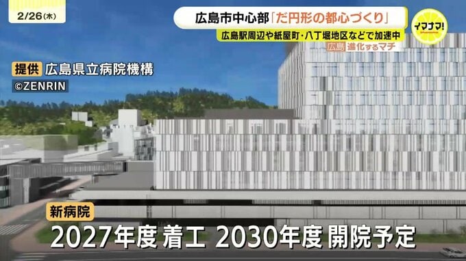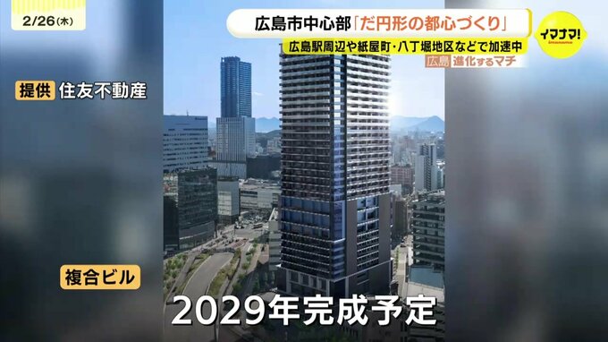 駅の北側、二葉の里地区では、10階建てのオフィスビル「ディール広島」が完成。その隣の敷地では、2月2日、住友不動産が31階建てのホテルやマンションなどが入る複合ビルの建設を開始しました。建設がはじまった複合ビルは、4階から9階がホテル、9階から11階は温浴施設、12階より上はマンションで、2029年に完成予定です。
