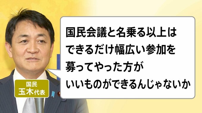 もともと、国民の玉木代表は「国民会議と名乗る以上は、できるだけ幅広い参加を募ってやった方がいいものができるんじゃないか」と話していました。要は、方向性が一緒の人だけではなく、反対する人も一緒にやった方がいいのではないかということです。