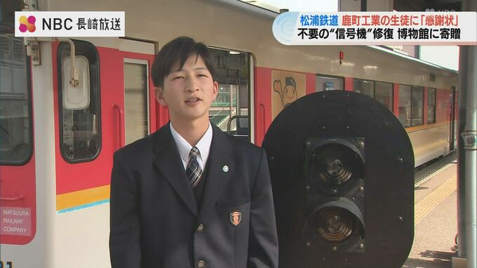 修復された列車進行の合図を示す『出発信号機』。今後は、日本最西端の駅として知られる「たびら平戸口駅」にある鉄道博物館で展示される予定です。
