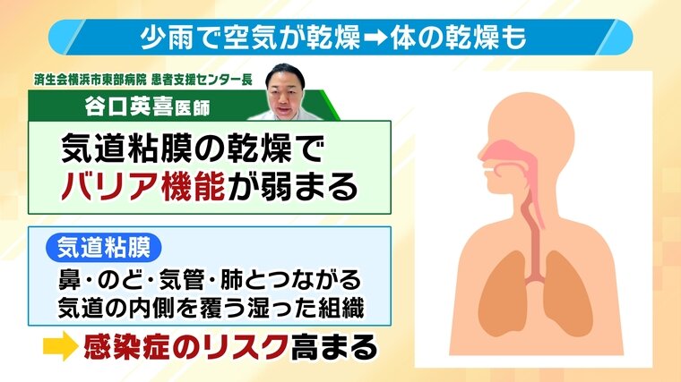 医師によると空気が乾燥すると気道粘膜が乾燥しバリア機能が弱まることで、インフルエンザなどに感染するリスクが高まるといいます。