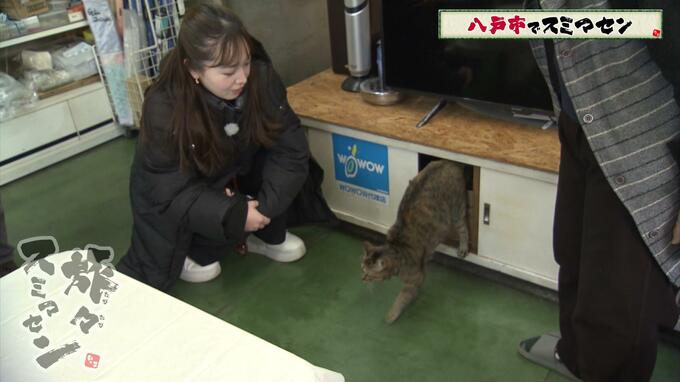 猫と遊ぶ白川アナ。みんなに注目されて、なんだか猫も居心地良さそうです。