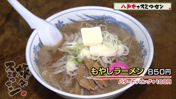 川口さんは【もやしラーメン】(850円)を注文。醤油ベースのスープと麺の上に、メンマ、ネギ、赤いナルト、そして追加100円でバターをトッピングしました。