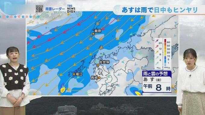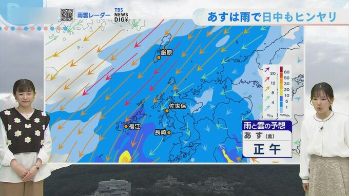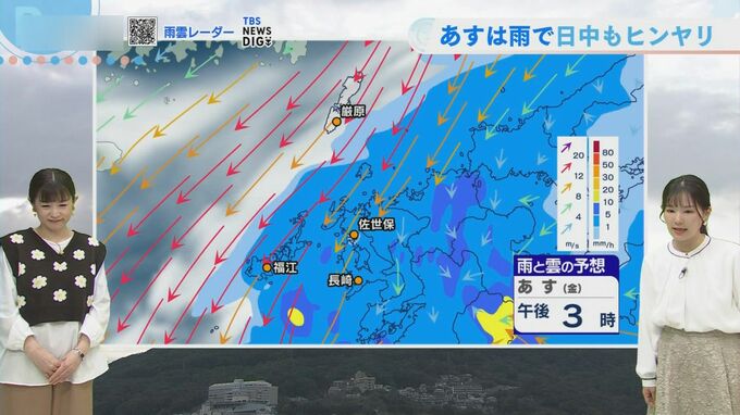 あす27日(金)は西から雨雲が接近し、朝の通勤・通学の時間帯から雨となる見込みです。雨と北風の影響により、日中もヒンヤリとした体感となりそうです。