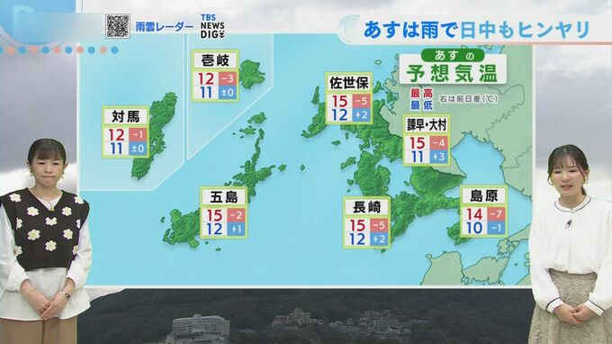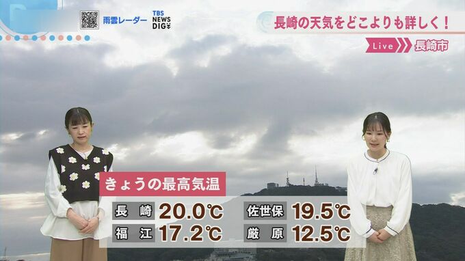 きょう26日(木)は長崎で20.0度を記録し、今シーズン2回目の20度超えとなりました。佐世保19.5度、福江17.2度と各地で暖かくなり、日中は上着なしでも過ごせる一日となりました。一方、長崎市内では日差しが届く中でも存在感のある雲が広がり、天気下り坂のサインが現れていました。