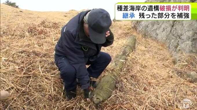 これに対して、破損が判明したのは海岸線にあるマイルポストです。海風が強く吹き付ける場所で、老朽化が進んだものと見られます。この場所は国立公園の中にあり現状の色や形を変えることはできないため、いまは破損したポストに触れず残った部分を補強しています。
