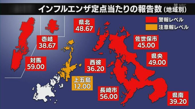 インフルエンザ患者、2週連続で減少も依然「警報レベル」 10代以下が全体の8割占める 長崎放送 2026年2月27日(金) 12:00 国内 長崎市が最多 五島を除く県内全域で「警報」 地域別で見ると、長崎市が最も多くなっています。五島を除く県内9つの地区で警報レベルとなっており、県内全域で流行が継続しています。