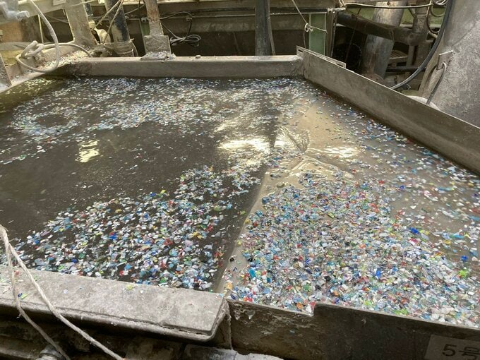 続けて、「リサイクル工程でペットボトルを細かく切って水に入れるのですが、その時リングは水に浮かび、ペットボトルは沈むので、その性質を使って分別します。」と、リサイクル工程の画像を添えて説明しました。