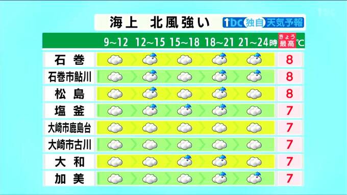 ■石巻:8℃ ■石巻市鮎川:8℃ ■松島:8℃