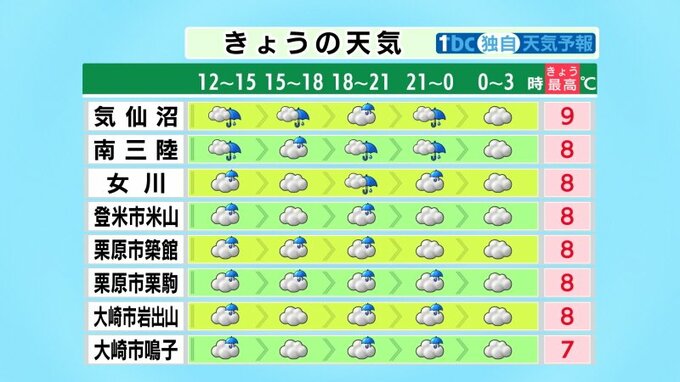 ■登米市米山:8℃ ■栗原市築館:8℃ ■栗原市栗駒:8℃