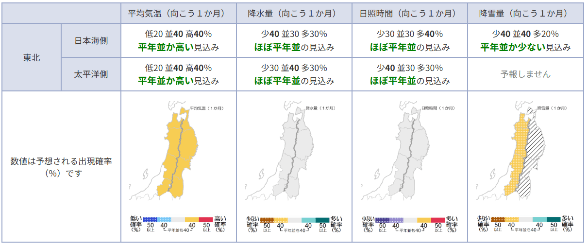 東北日本海側:ほぼ平年並の見込み 東北太平洋側:ほぼ平年並の見込み