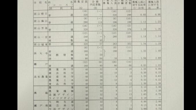 【高校入試2026】岡山県公立高校 一般選抜入試最終倍率 【全校掲載】 RSK山陽放送 2026年2月27日(金) 13:05 国内 岡山県教育委員会はきょう(27日)公立高校の一般選抜入試について受験倍率を発表しました。 ▶各高校の受験倍率を画像でみる ▶各高校の受験倍率を画像でみる