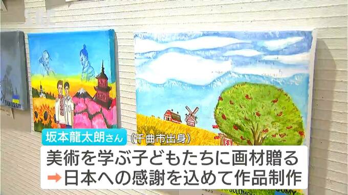作品は隣国のポーランドで支援活動を行う千曲市出身の坂本龍太朗さんがウクライナで美術を学ぶ子どもたちに、キャンバスや絵の具などを贈った縁で日本への感謝を込めて描かれました。