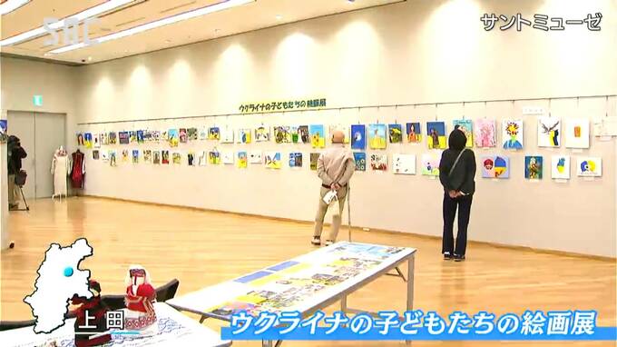 上田市のサントミューゼで開かれている絵画展には、戦時下で描かれたウクライナの子どもたちの作品およそ200点が展示されています。
