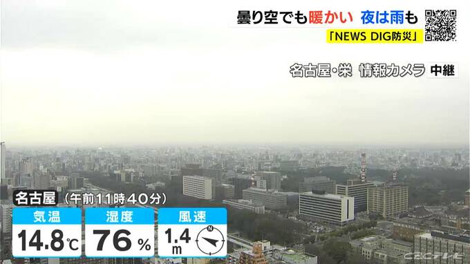 正午前の名古屋市内は雲が広がり、すっきりしない空模様となっています。気温は14.8℃で、この時期としては高い気温が続いています。