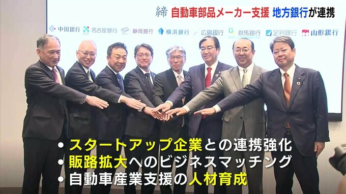 自動車部品メーカーを支援しようと、広島銀行など各地の地方銀行が広域連携協定を締結しました。協定を結んだのは、名古屋銀行や静岡銀行など自動車産業が集まる地域の地方銀行8行で、それぞれの頭取が一堂に会し…