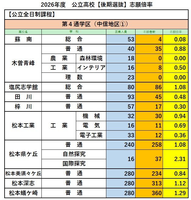 【全校一覧掲載】長野県公立高校入試2026 後期選抜志願倍率 全日制課程の志願者は7839人 志願倍率は0.89倍 伊那北の理数が4.75倍 長野西の国際教養が3.75倍 飯田の理数が2.42倍 信越放送 2026年2月27日(金) 17:03 国内 第4通学区(中信地区①)