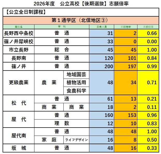 【全校一覧掲載】長野県公立高校入試2026 後期選抜志願倍率 全日制課程の志願者は7839人 志願倍率は0.89倍 伊那北の理数が4.75倍 長野西の国際教養が3.75倍 飯田の理数が2.42倍 信越放送 2026年2月27日(金) 17:03 国内 第1通学区(北信地区③)