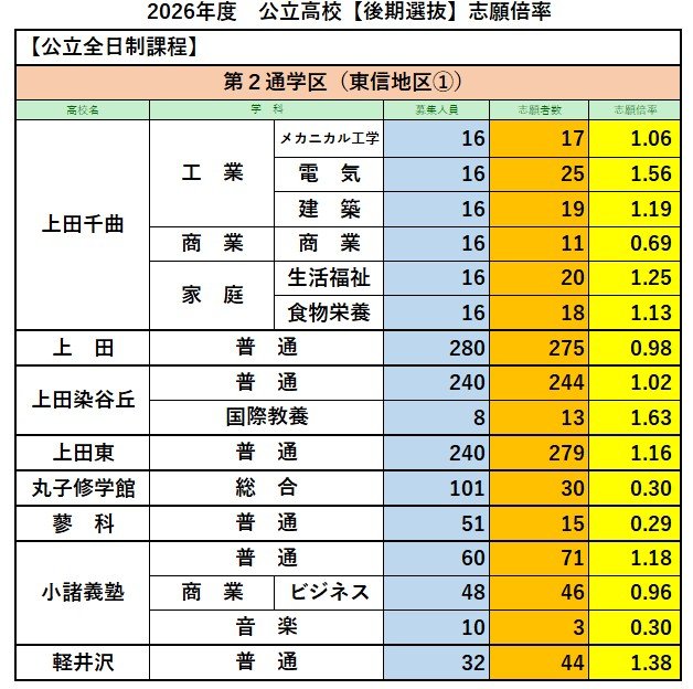【全校一覧掲載】長野県公立高校入試2026 後期選抜志願倍率 全日制課程の志願者は7839人 志願倍率は0.89倍 伊那北の理数が4.75倍 長野西の国際教養が3.75倍 飯田の理数が2.42倍 信越放送 2026年2月27日(金) 17:03 国内 第2通学区(東信地区①)