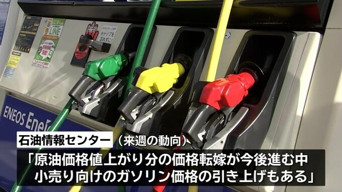 石油情報センターは来週の動向について「原油価格の値上がり分の価格転嫁が今後進む中で、小売り向けのガソリン価格の引き上げもある」として「値上がりになる」と分析しています。