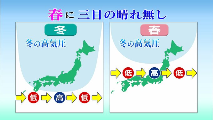 冬は、上空の寒気が日本列島全体を覆いますが、春は上空の寒気が北に退き、日本列島上空に高気圧や低気圧の通り道ができ、ほぼ交互に通過するようになります。