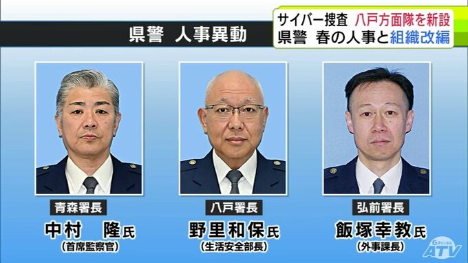 組織改編では、サイバー犯罪の広域性に対応するため「特別捜査隊八戸方面隊」を新設するほか、交通事故の取り扱い件数が少ない高速道路交通警察隊碇ヶ関分駐隊を廃止し、青森本隊などに人員を配分します。
