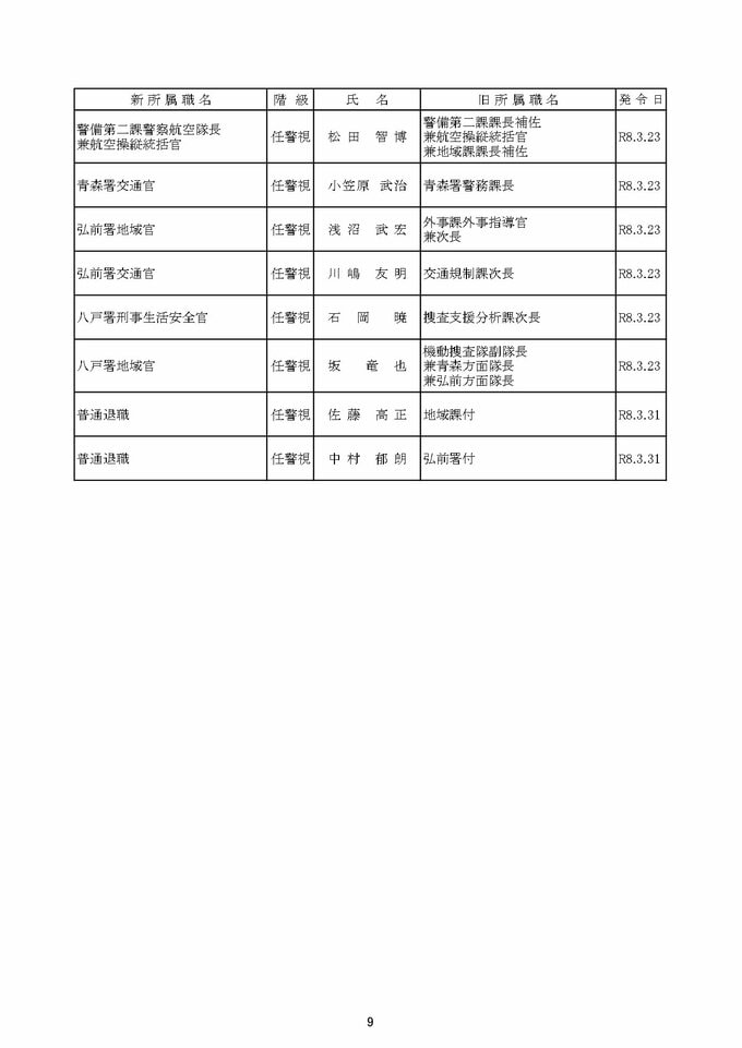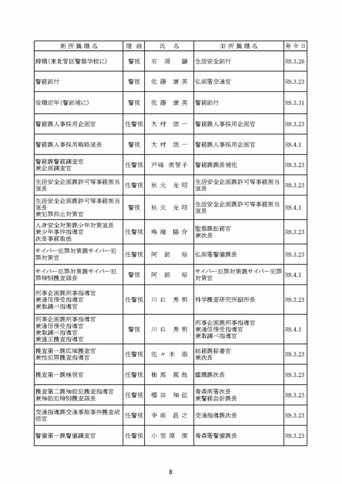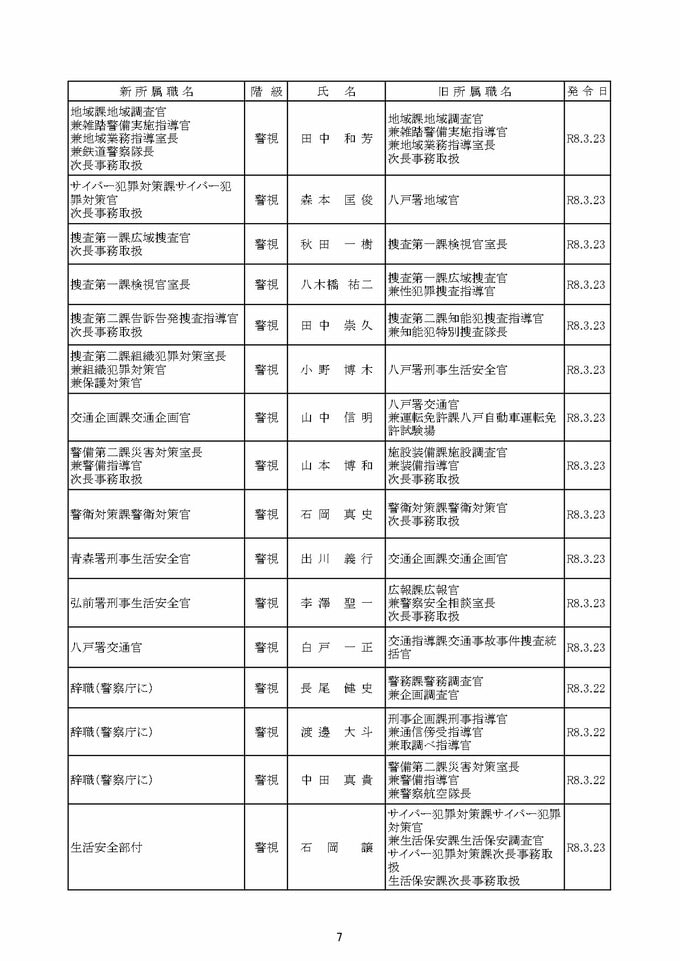 青森県警察本部 定期人事異動 組織改編 2026年春 人事異動は約1200人規模 本部所属長は36人中28人が異動 警察署長は17人中15人が異動【一覧あり・全掲載】 青森テレビ 2026年2月28日(土) 06:45 国内 【青森県警察本部 定期人事異動:目次】 ①警視正 ②警視 (1ページ目/2ページ目) ③警部 (1ページ目/2ページ目/3ページ目) ④警察行政職員 (1ページ目/2ページ目) 【この記事の画像を見る】 【この記事を最初から読む】