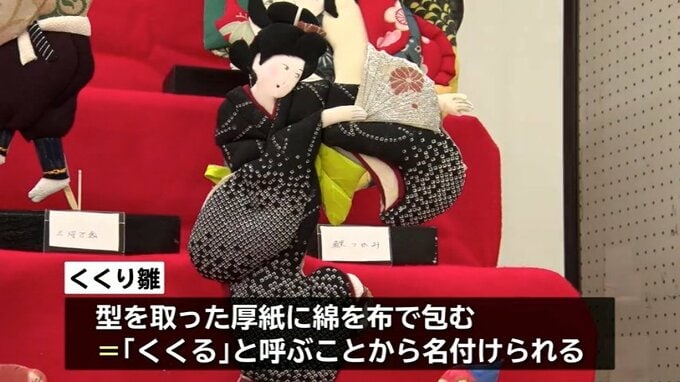 「くくり雛」は、押し絵の技法で作られるひな人形で、型を取った厚紙に綿を布で包むことを「くくる」と呼ぶことから名づけられたと言われています。