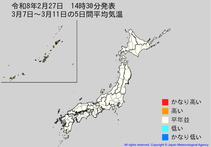 【2週間気温予報】北・東・西日本の気温は向こう1週間程度は高い日が多い予報 3月3日頃まではかなり高い日もある見込み 農作物の管理などに注意 全国の天気を画像で 気象庁 テレビユー山形 2026年2月27日(金) 15:14 国内 ■3月7日~3月11日の5日間平均気温(画像) ・8日先から12日先まで5日間平均した日平均気温を表示しています。 ・かなり高い(かなり低い)は、かなり高い(かなり低い)気温となる確率が30%以上のときに表示します。