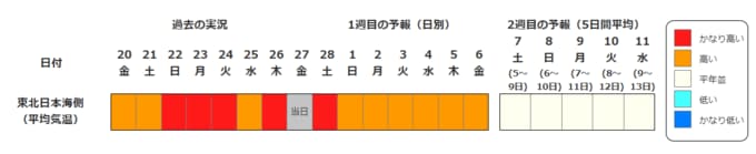 ・2週目の予報は中心の日に前後2日間を加えた5日間の平均(最高気温の5日間平均、最低気温の5日間平均、平均気温の5日間平均)です。平均期間を中心の日の下に表示しています。2週目のかなり高い(かなり低い)は、かなり高い(かなり低い)気温となる確率が30%以上のときに表示します。
