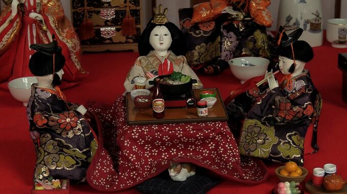 ほかの場所では、すき焼きを食べたりゲームをしたりするお雛様など、創意工夫を凝らした展示も。