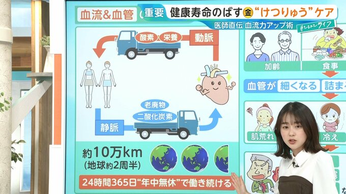 人間の血管の長さは約10万キロ、地球の約2周半分もあり、24時間365日、年中無休で働き続けています。