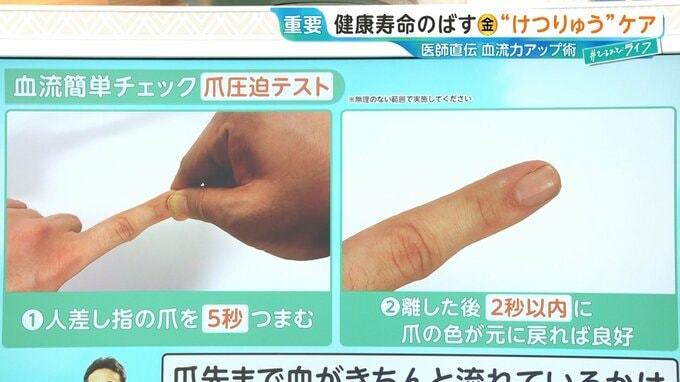 できれば2秒以内に色が戻るのが望ましいですね。「赤み」は酸素なので、末梢までちゃんと酸素が流れてるかどうか、いわゆる血管の健康状態が簡単にわかる方法なんです。