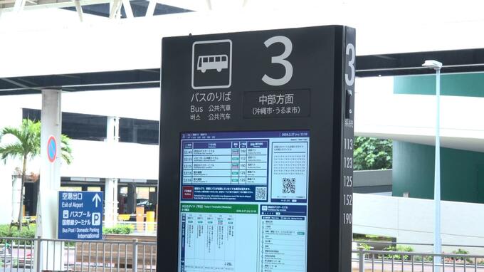 那覇空港到着口のバス乗り場の案内板が、防災機能を備えたデジタルサイネージとして生まれ変わりました。
